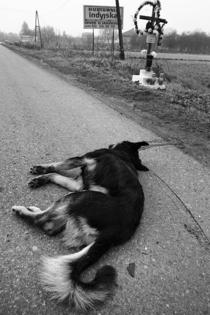 But some of my photographs are also a metaphorical warning that I want to pass on, like the image of a dead, crucified crow or that of a dog already looking helplessly at the carriageway.